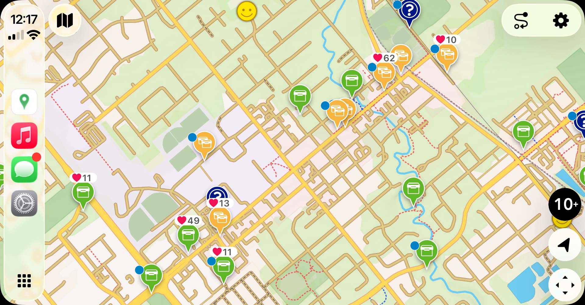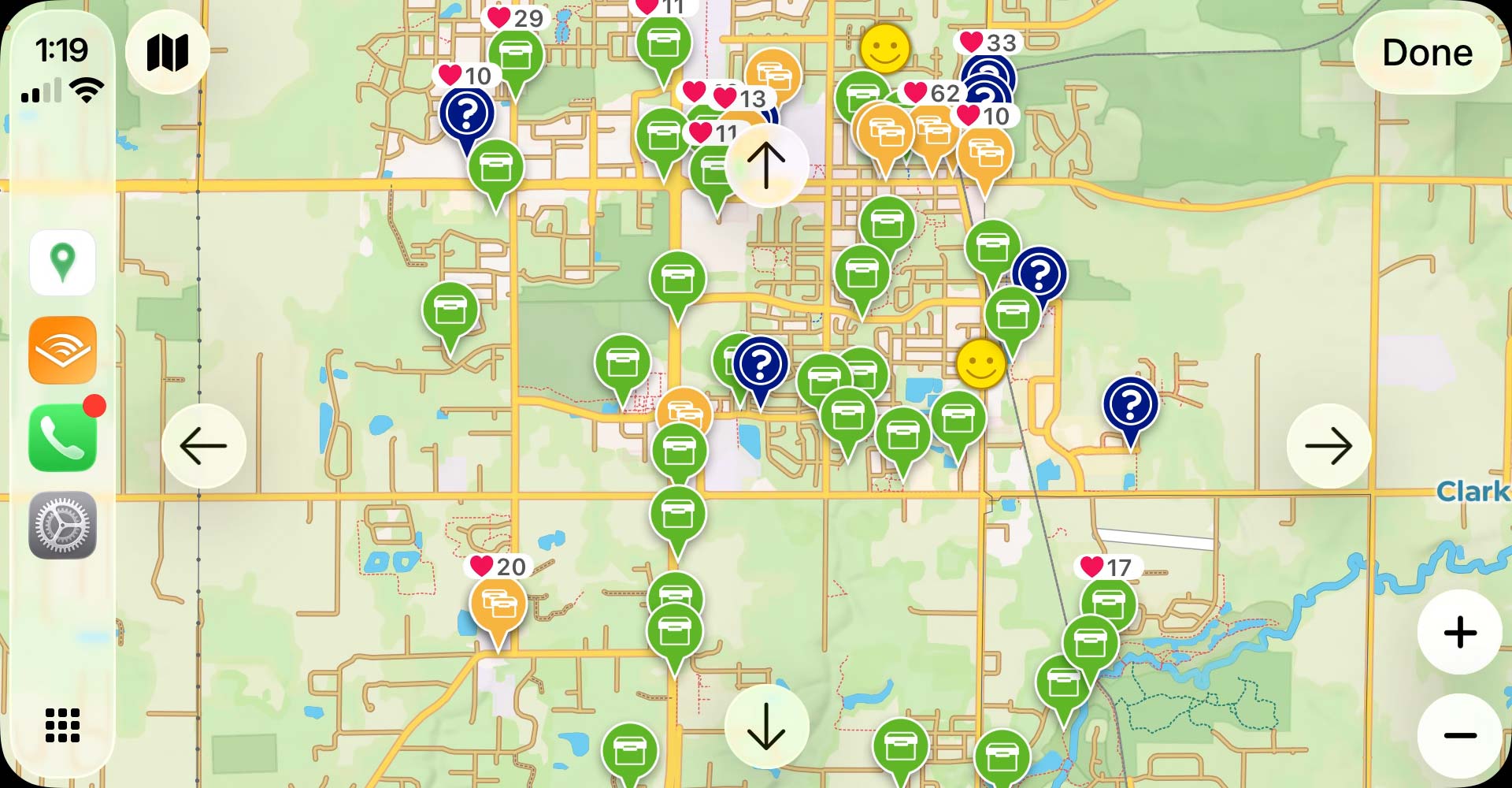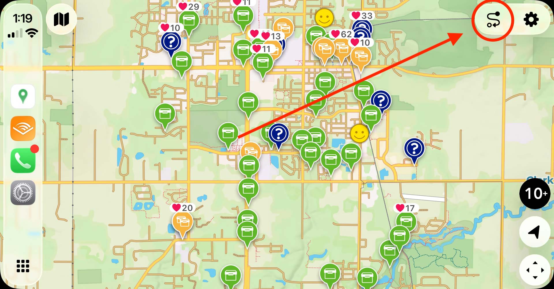 The CarPlay map is your primary interface for discovering geocaches while driving. It displays geocache locations as pins with icons indicating the cache type and cache titles at higher zoom levels.