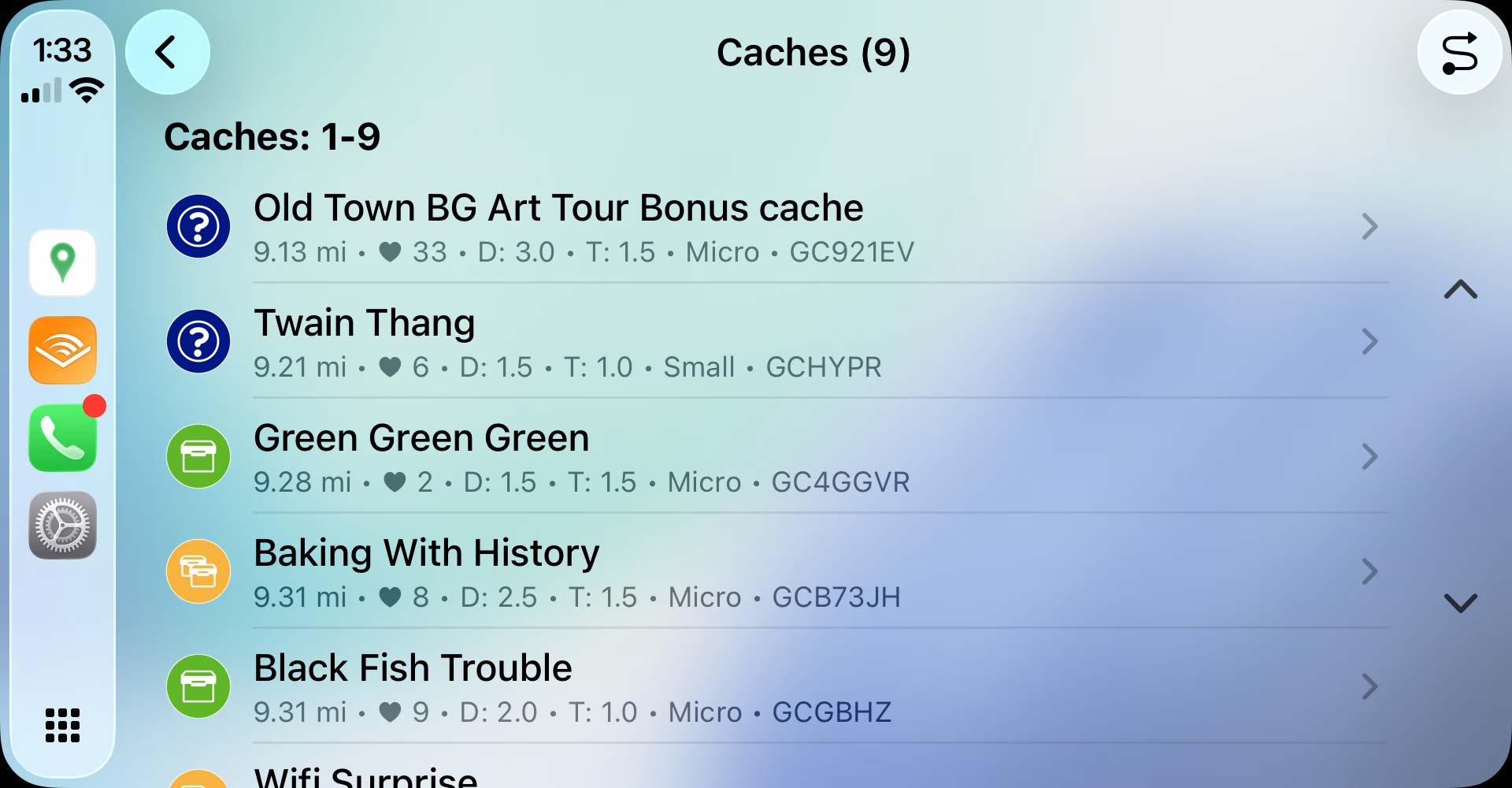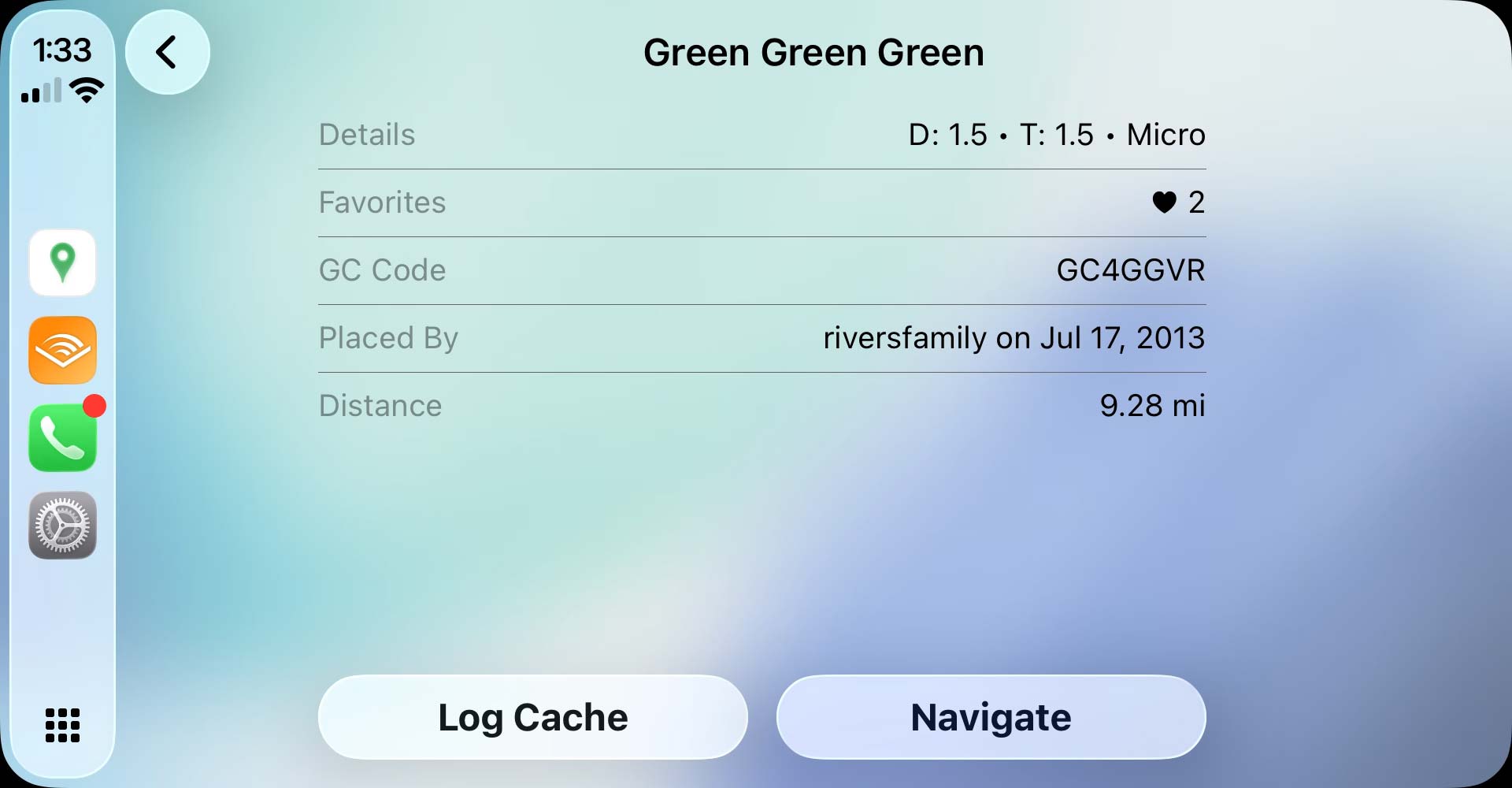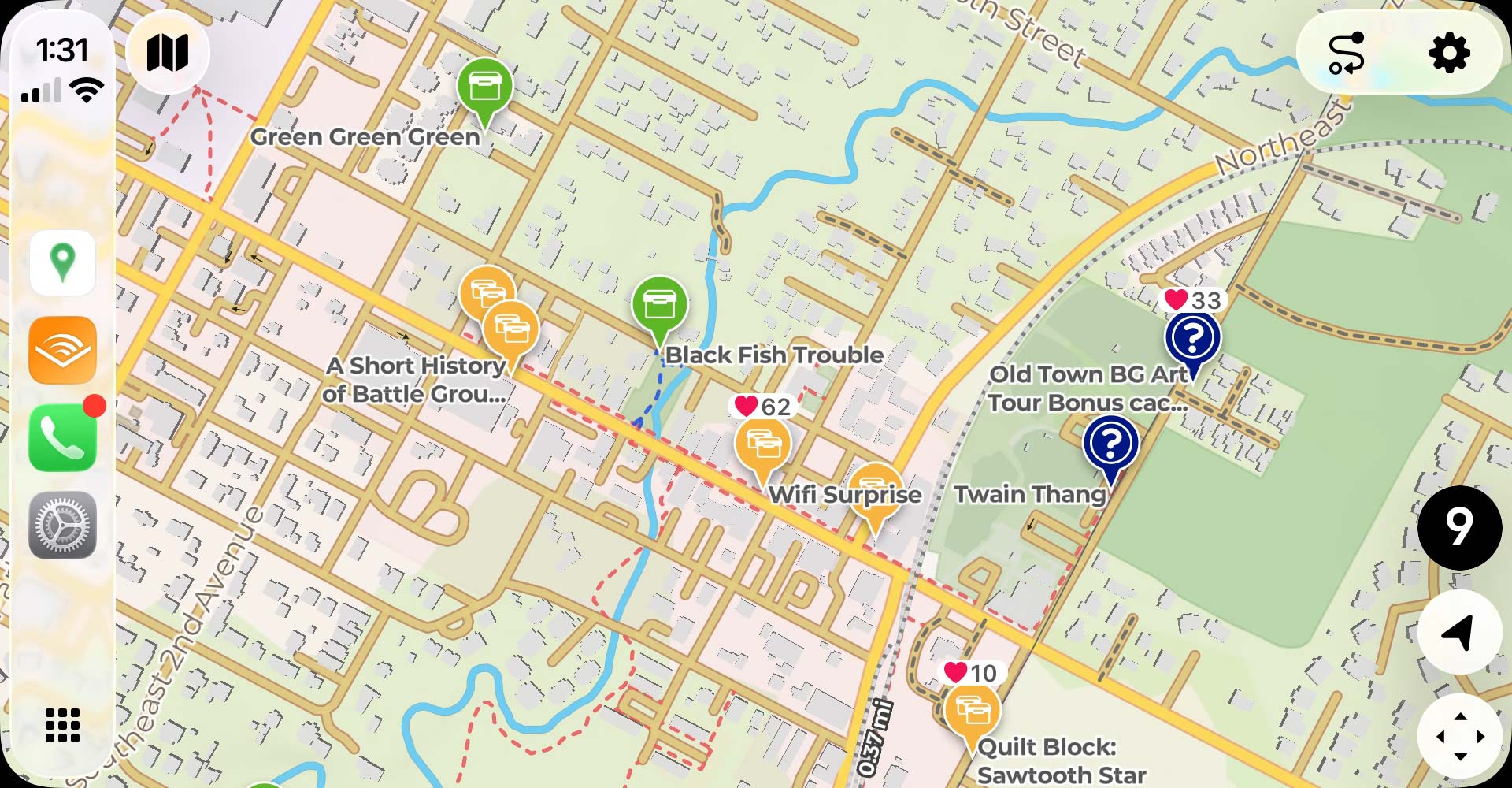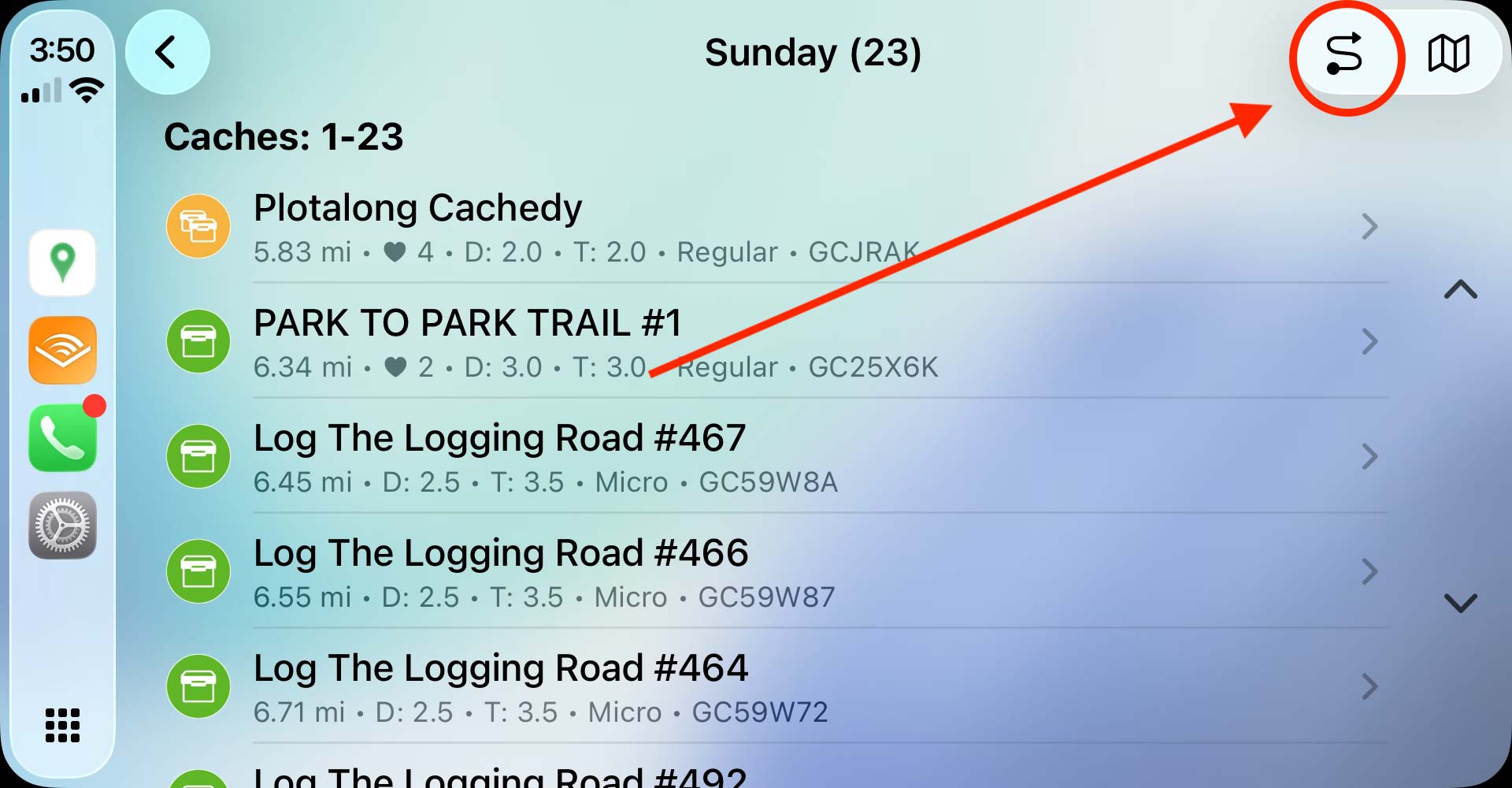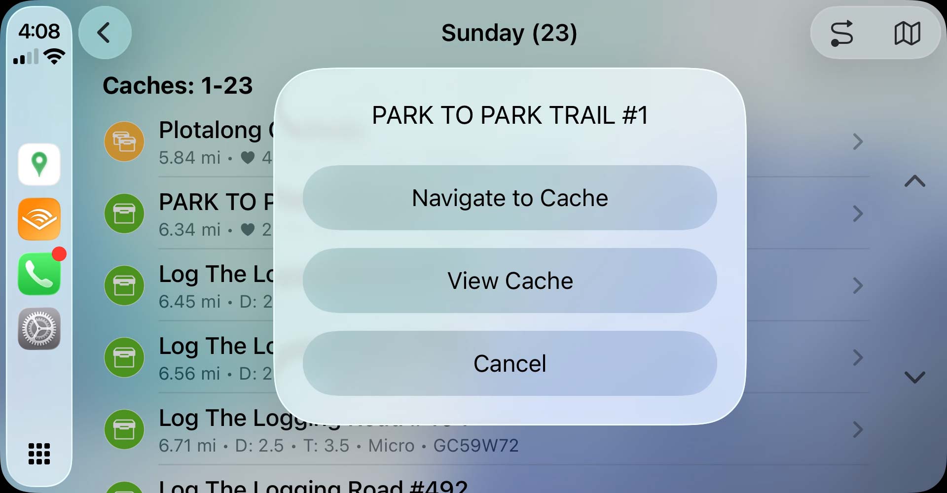 - Cannot tap on cache pins: You must use the cache list to select and interact with geocaches. This is a limitation of CarPlay itself, imposed by Apple.
