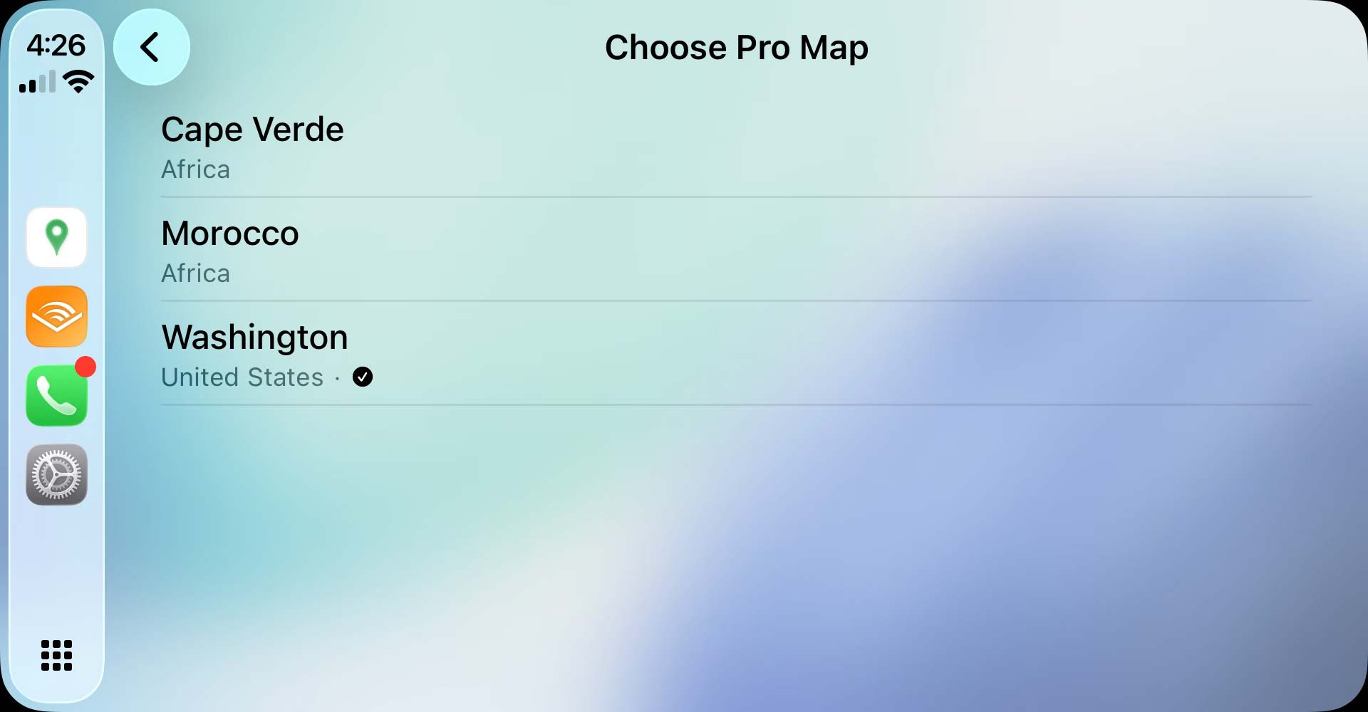 Access settings from the main menu to customize your CarPlay experience.